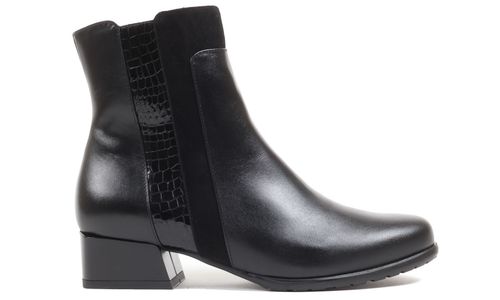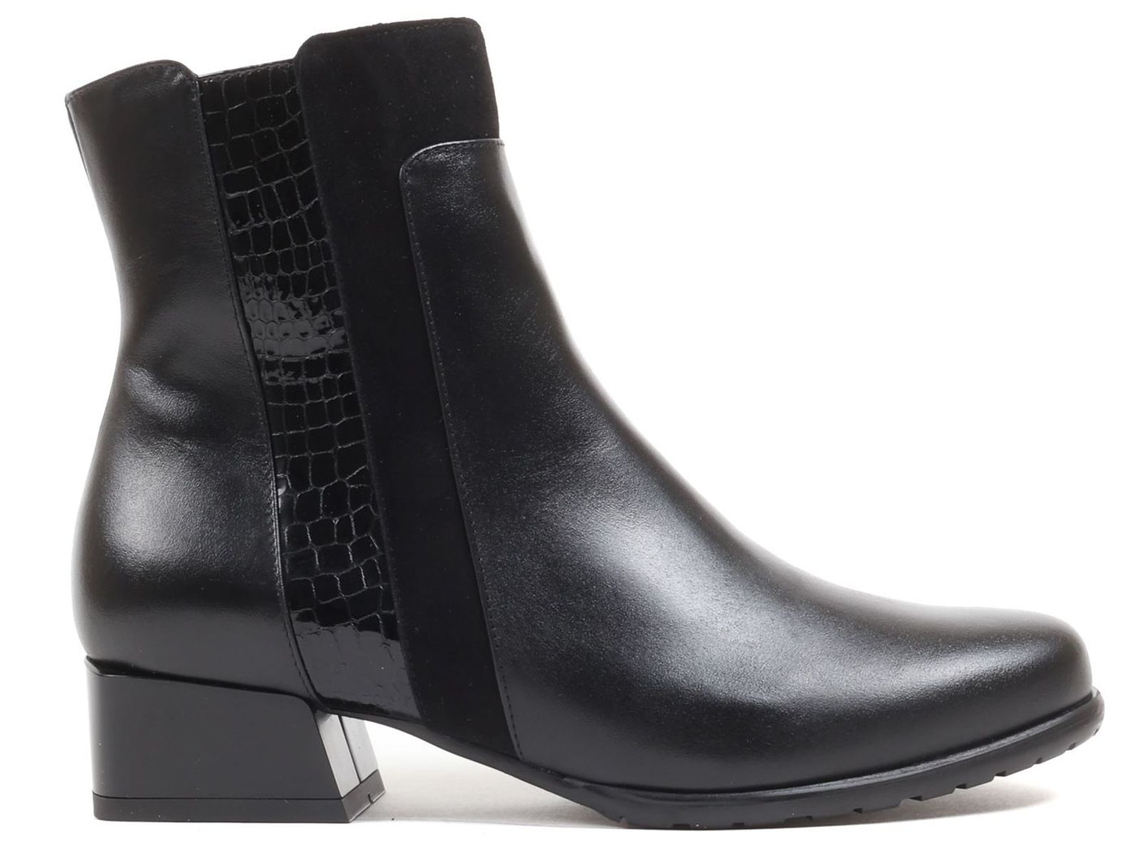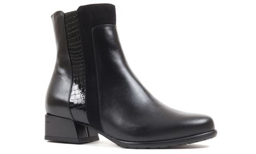 Stijlvol en comfortabel! Deze zwarte enkellaars van zacht leder met crocoprint combineert elegantie en gemak. Dankzij de blokhak en ritssluiting draag je ze moeiteloos, elke dag opnieuw.
